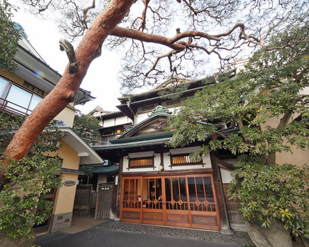 一階正面玄関の唐破風(からはふ)は瓦葺(かわらぶ)きで破風にみごとな彫り物が施され、重厚な感があり、東側の二階客室窓の肘掛を支える連なった持送(もちおく)りや彫物(ほりもの)、そして階下の銅葺(あかぶき)屋根のついた黒塀(くろべい)が老舗(しにせ)の風情を醸(かも)し出している。