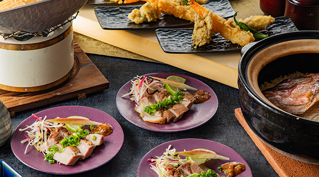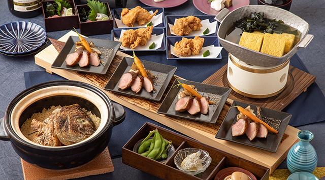 「あたらよ」とは、明けるのが惜しいほど特別な時間の意味。その名の通り、過ごし心地のよい和モダン空間と本格和食のおもてなしをどうぞ。宗田節や鯖節も使った旨味深い出汁を基本に、季節を映し出す料理の数々。豊後備長炭で引き出すのは黒毛和牛や銘柄豚の滋味深さ。そして、選り抜きの酒で祝杯を。最後は名物の真鯛土鍋ご飯をご両家で囲んで。空間と食と杯で織りなすご家族同士の繋がりは、後々にも思い出す価値あるひと時に。