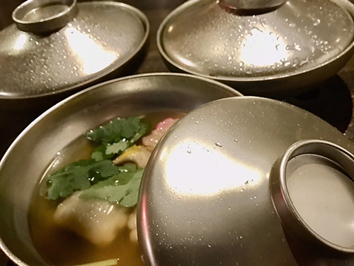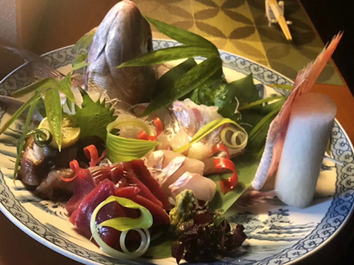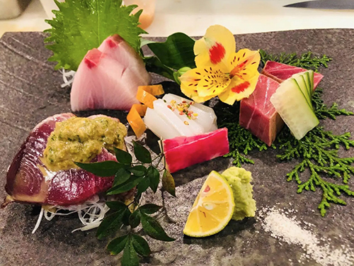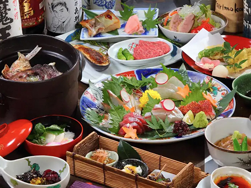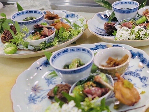 ◆季節のお通し(神戸牛肉寿司、手羽先の唐揚げ自家製柚子胡椒、酢の物、女将手作りおばんざい) |