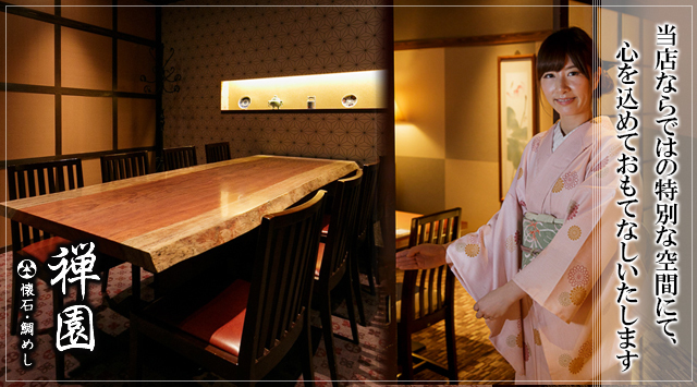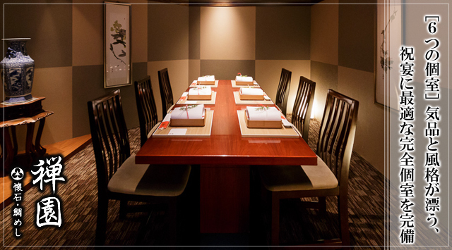 台北郊外にある「小師禅園十六茶舗」に習い、 その設えへの感銘から禅園は生まれました。 どこか異国情緒が漂う、気品と風格を備えた、 当店ならではの完全個室を多数ご用意しております。